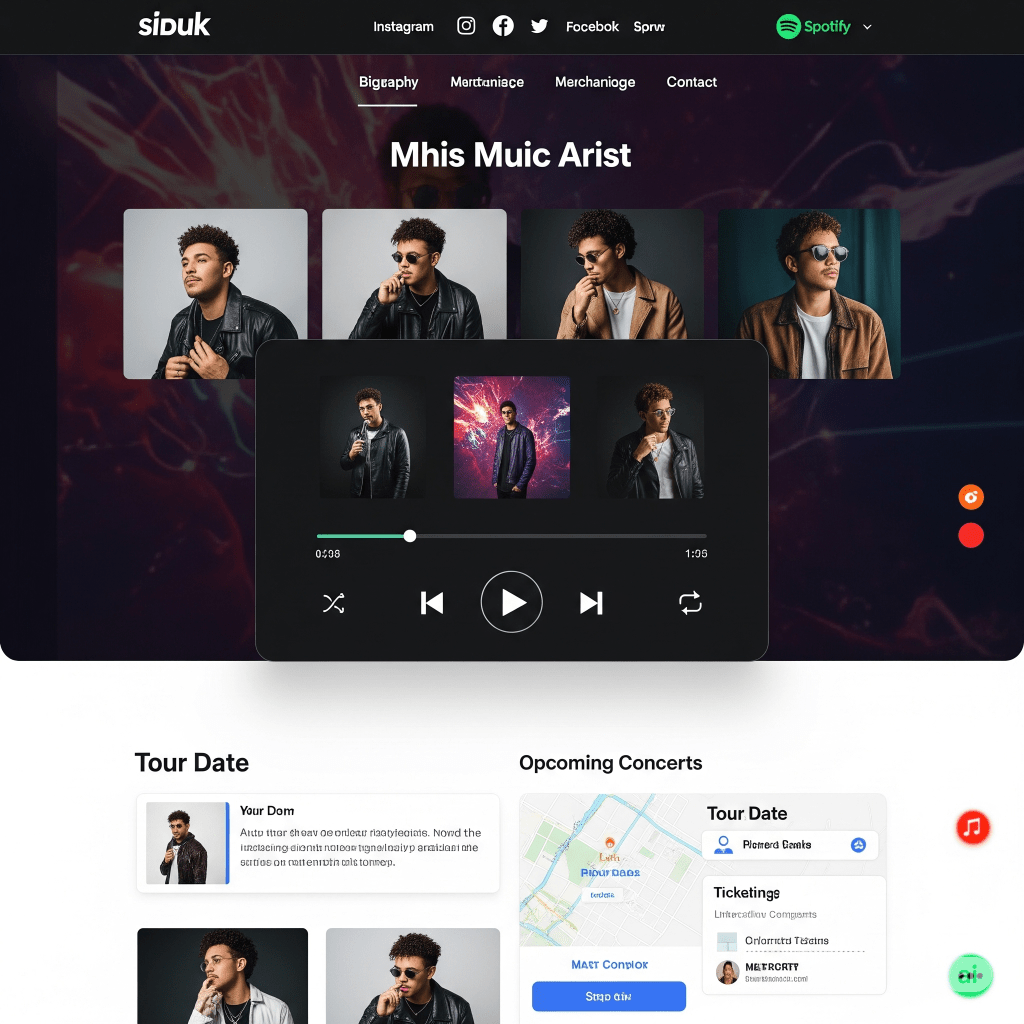 - Tour Dates/Events: Clear calendar of upcoming performances, with venue details, ticket links, and even RSVP options.